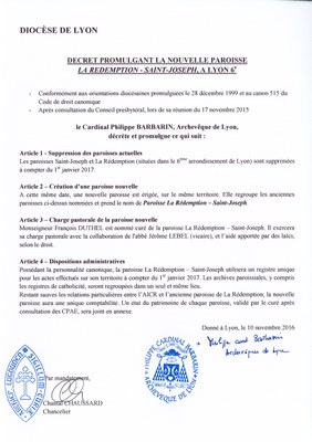 Promulgation de la nouvelle paroisse de la Rédemption-Saint Joseph (Lyon 6°)
